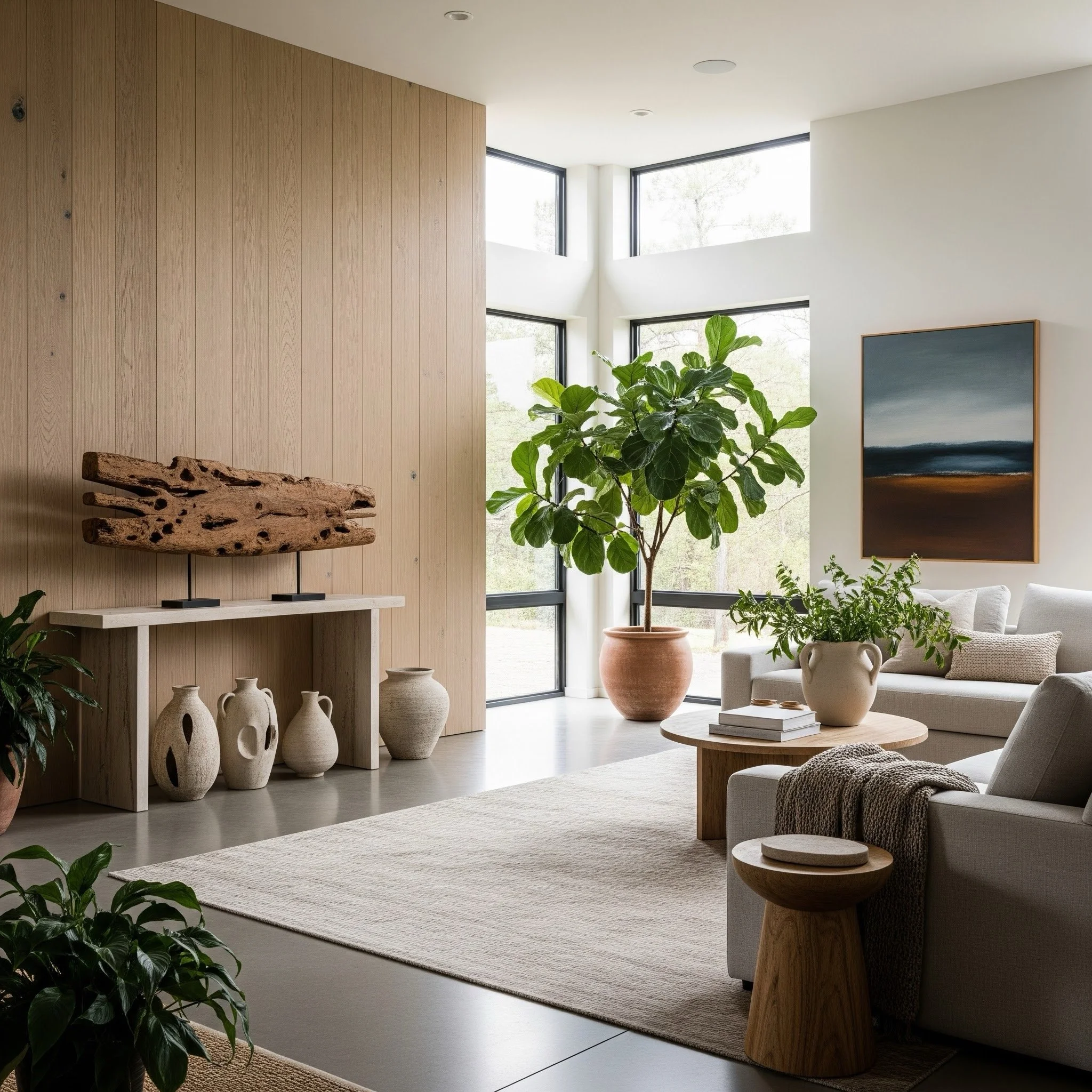 Calm, neutral, and nature-grounded: warm whites, light oak, soft black accents, linen, ceramic, and greenery. We edit before we add, design with flow, and finish with life.