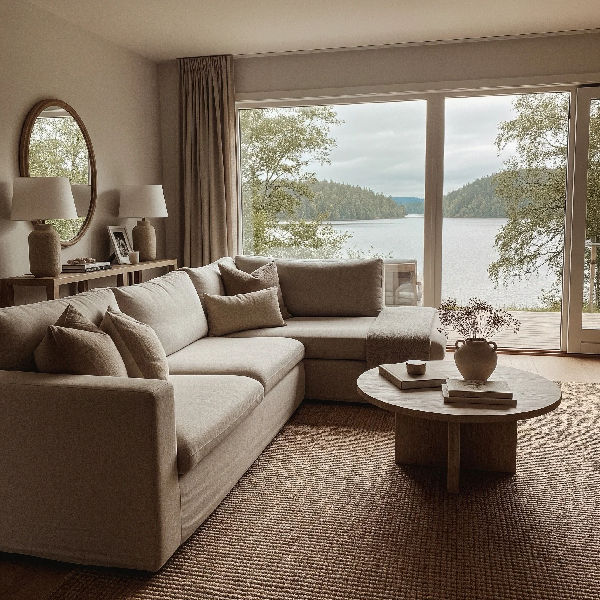 Clear sightlines to the lake from entry; balanced scale makes room feel larger.