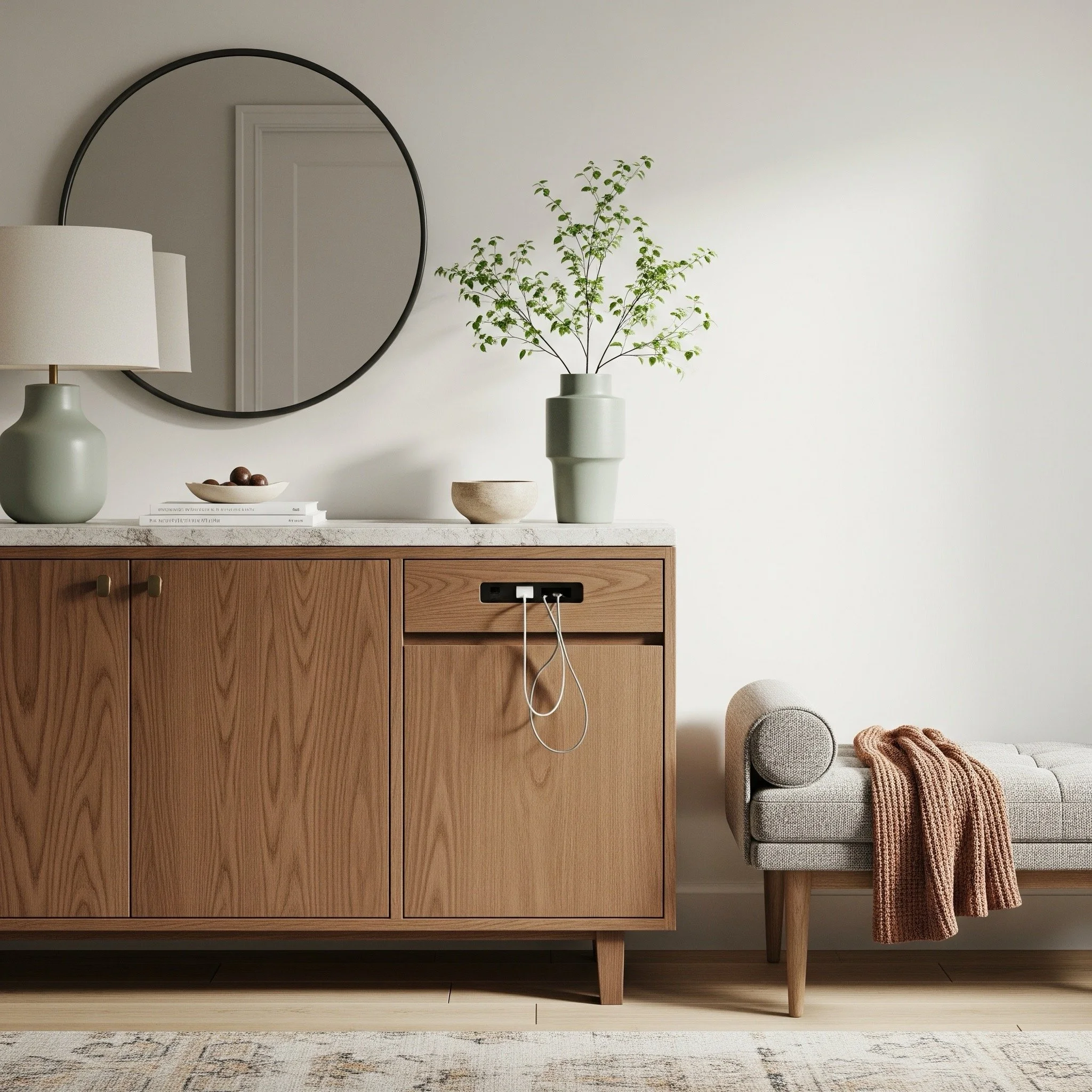 Storage: closed entry console + wall of hooks concealed behind a slatted screen; hidden charging drawer.