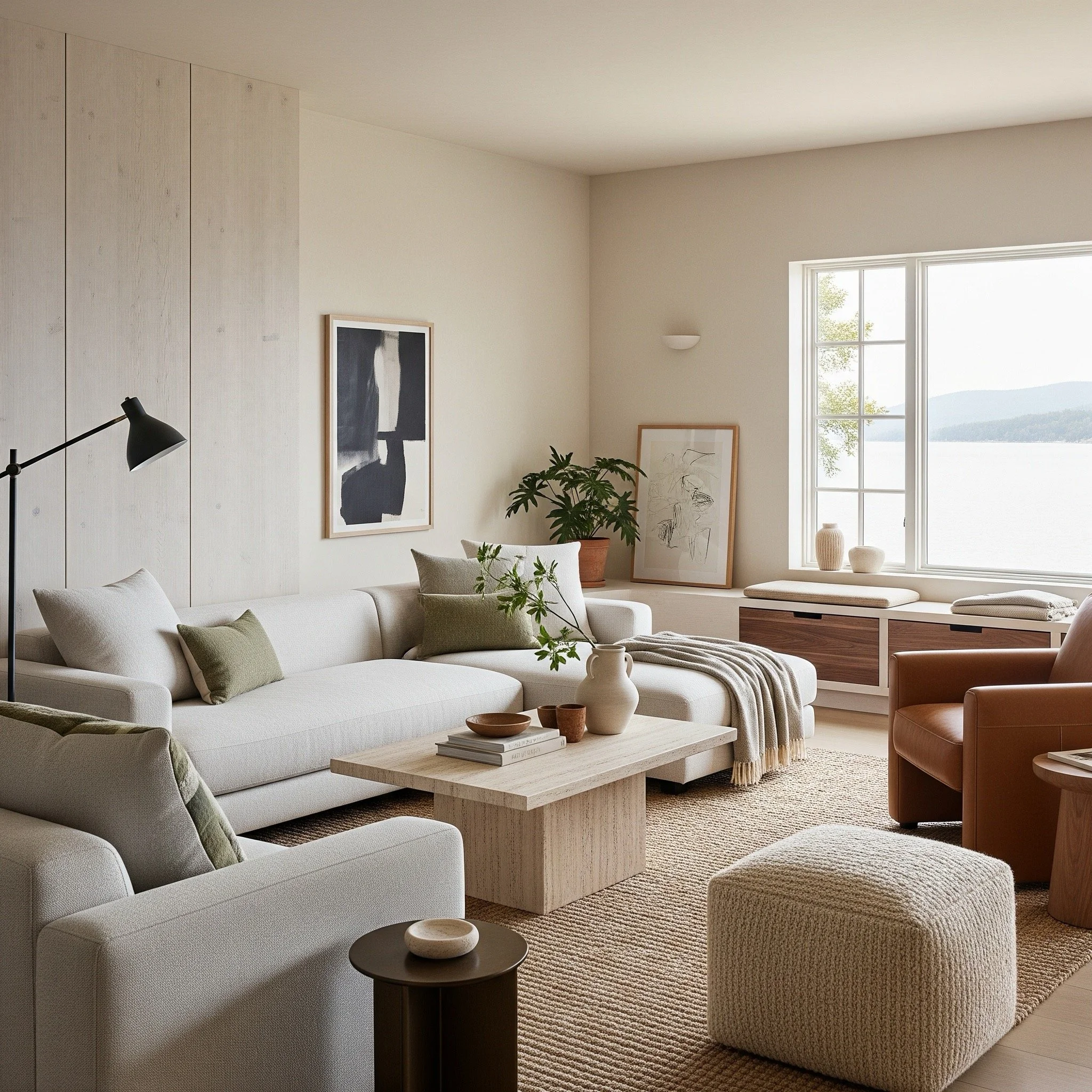 Layout: light-toned sectional oriented to view + conversation, two textural reading chairs, oversized 48" round coffee table for flow.